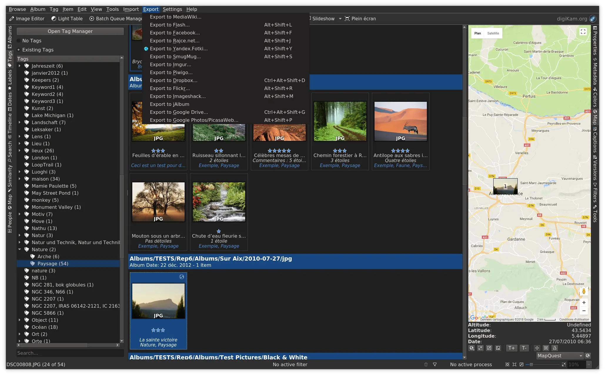 Additionally, digiKam includes tools for importing and exporting content to remote web services such as Flickr, Google Photos, and Imgur.